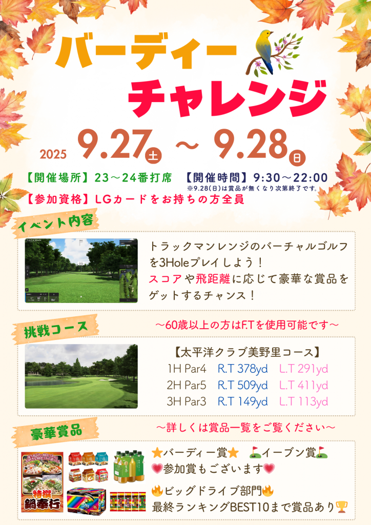 9/27(土)と9/28(日)の二日間、トラックマンレンジのバーチャルゴルフを使ったイベント「バーディーチャレンジ」を開催予定です!!