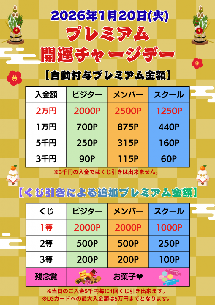 お得な自動付与プレミアム金額や、くじ引きによる追加獲得出来るプレミアム金額は下記↓のお知らせをチェック!!